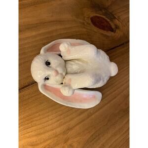 The product is a vintage holiday figurine depicting two white ceramic bunnies, "Lopsy & Topsy." This charming figurine is perfect for Easter decor and features long floppy ears, adding a playful touch to any collection. Made from ceramic, these adorable bunnies showcase the craftsmanship of a bygone era and are sure to be a delightful addition to any collector's display.