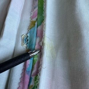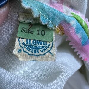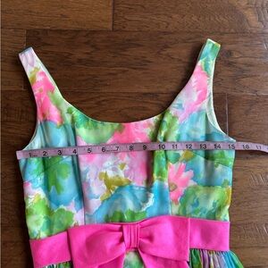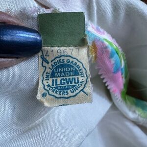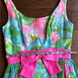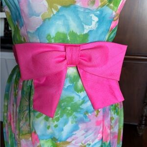Gorgeous mid century old Hollywood prom gown Bridgerton inspired Union Made ILGWU label bright watercolor garden party flowers all over back hidden zipper hook closure fulled lined attached chiffon pleated overlay and large hot pink attached bow ( it’s vintage will needs cleaning minor spots inside on liner and around the collar) otherwise this vintage beauty is is great condition smoke/pet free home
