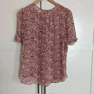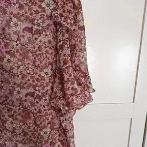 Nwt Status by Chenault floral short sleeve top. Three buttons with tie up at neck and ruffled sleeves. See-through and flowy. 100% polyester. Length across chest 23", height from shoulder to bottom 23.5".