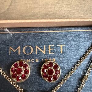 Chic Monet necklace with a gold chain and red heart pendant. Includes matching earrings. Ideal for any occasion.