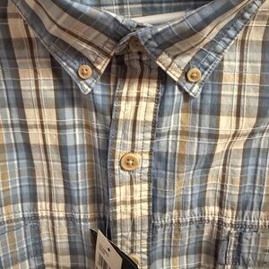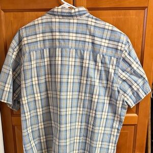G H Bass Rock River Textures shirt…blue plaid, short sleeves, button up, dual front pockets, button down collar, 100% cotton.