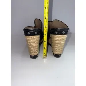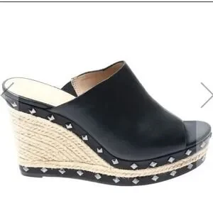 FEATURES/ACCENTS: Espadrille High platform heel. Stud accents. Open toe. Black color. Gore on sides for easy fit, Slip on style.
