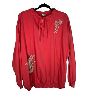 Keywords: Crazy Shirts, Hawaii, pullover, sweatshirt, coral, floral, embroidery, cotton, long sleeve, casual, Loungewear, beachwear, resort, Henley, collector's, 90s