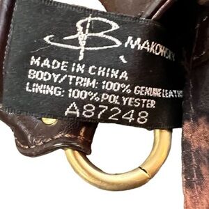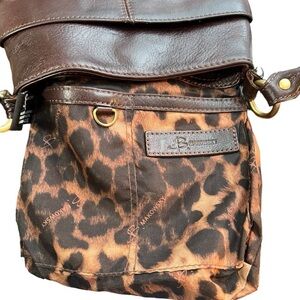 Hands free leather bag has an attached leather strap depth 23”