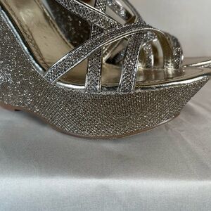 Step out in style with these elegant silver wedge sandals. Perfect for any occasion, these shoes offer both comfort and sophistication.