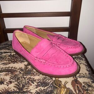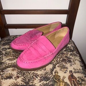 Add a vibrant pop of color to your wardrobe with these chic J.Crew pink suede penny loafers.