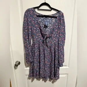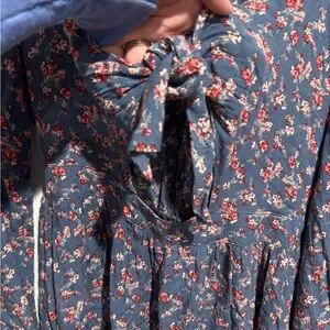 Charming blue midi dress with floral pattern. Features a tie-front detail. Perfect for casual outings.nwt
