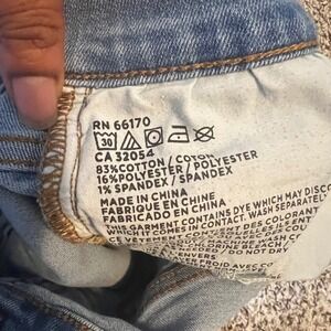 BDG high rise twig ankle jeans in a light wash. These denim pants feature a classic button fly closure and a flattering ankle length. Perfect for casual everyday wear, weekend outings, or a relaxed brunch. Jean has been stretched some in button area. See photo. Also a snag on front right leg. See photo.