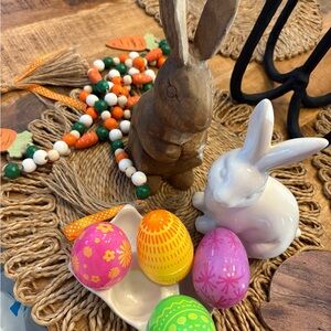 Charming Easter decor set featuring a wooden bunny, a ceramic bunny, and colorful eggs. Perfect for festive decoration.