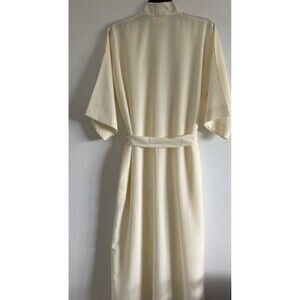 This Vintage Women's Bill Blass Lightweight Bath Robe in ivory with stripes is a stylish and comfortable addition to any woman's sleepwear collection. this robe features a tie closure, 3/4 sleeves, and is belted for a flattering fit.