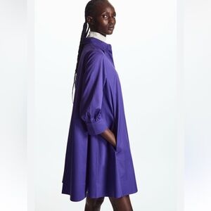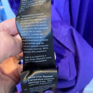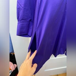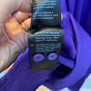 So flattering and modern. Made mostly of cotton and some elastic. Measures 19 inches pit to pit and is 33 inches long from shoulder to bottom hem. Fits like a medium. Three Quarter sleeve style. Also has two side pockets.