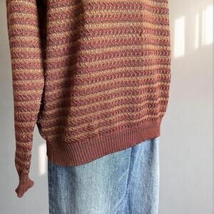 rust, merino wool, micro stripe, crew neck, drop shoulders, ribbed trim, earthy tones, fall layer, vintage knit, retro 90s