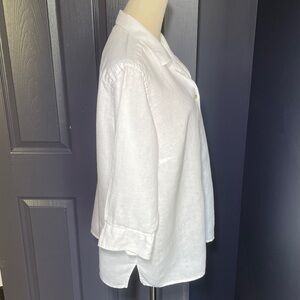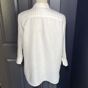 Chic white button-down linen shirt by Lauren Ralph Lauren. Features notch collar and 3/4 sleeves.