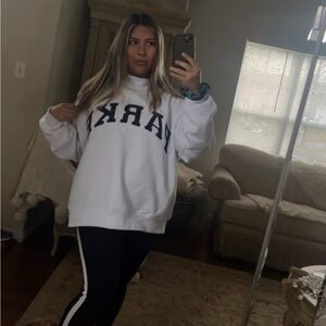 White sweatshirt with 'PARKE' logo in black. Comfortable and stylish.