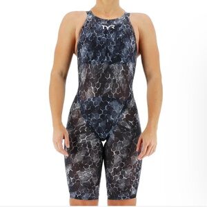 Sleek TYR swimsuit with a dynamic black and gray design. Ideal for competitive swimmers.
