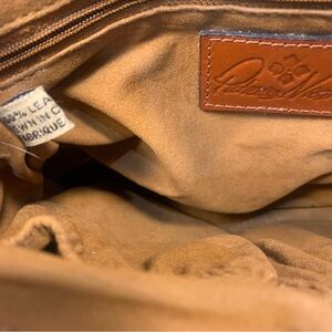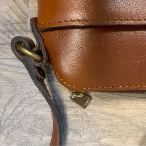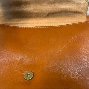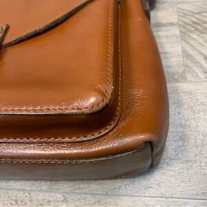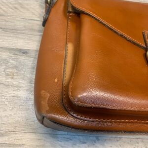 Lovely cognac leather Avellino crossbody bag by Patricia Nash. Classic English saddle tan. See pictures for some light discoloration on one side and light corner damage and some light dusting inside overall very good condition.