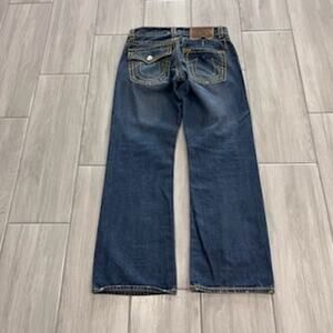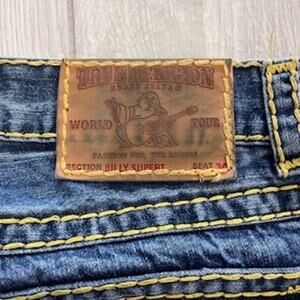 True Religion Billy SuperT men's size 30/30 boot flare blue jeans with yellow stitching. Missing back pocket button. Otherwise in excellent condition from a smoke free home. In excellent condition from a smoke free home.