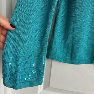 Susan Bristol sweater, sequin sweater, turquoise knit top, coastal grandma style, classy resort sweater, spring layering top, sparkle detail sweater, v-neck pullover, turquoise long sleeve, embroidered sweater, elegant casual, women’s medium, cotton rayon blend, dressy casual knit, cruise wear, beach house style, summer, cruise wear, vacation, resortwear, lightweight, sequins, party, colorful, elegant, sequined, romantic date, date night, theater, dressy, pretty, anniversary, Mother’s Day, Graduation, embellished, classic, relaxed, sparkly, country club threads