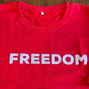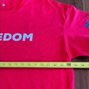 NEW! Crisp Vibrant red t-shirt featuring 'FREEDOM' text and a flag design on the sleeve. Measurements in pics. Red White Blue Stars any stripes.