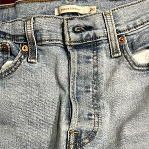 Stylish Levi's jeans with a straight leg cut. Light gray with a trendy distressed look. Ideal for casual outings.
