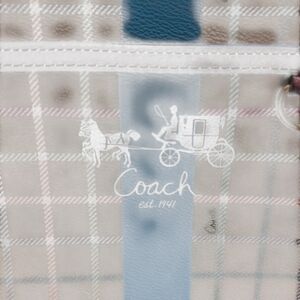 Stylish Coach crossbody bag in beige checkered pattern. Features a bold blue stripe. Perfect for everyday use.