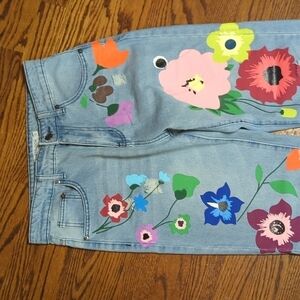 Flower Power retro baggy straight leg hi rise painted denim jeans W29