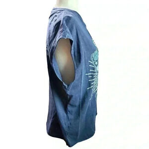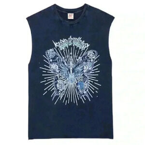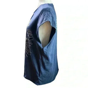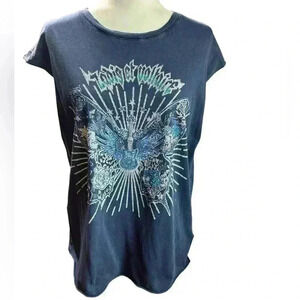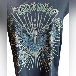 Preowned - Very Good Condition! Perfect concert shirt… beautiful crystals adorn a large butterfly, skeleton Guitar with wings - Rock and Roll!