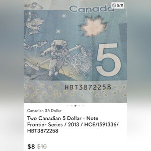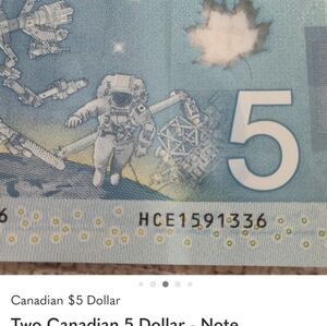 The $5 note in the Frontiers series was released on 7 November 2013, the same day as the $10 note. The design of the note focuses on the theme of space exploration, including Canada’s ongoing contribution to the International Space Station program through innovations in robotics. The vignette on the back of the note features the Canadian-built Mobile Servicing System. The system consists of the Canadarm2, Dextre and the Mobile Base, which are robotic tools used to help assemble and maintain the space station while in orbit. The image of the astronaut acknowledges all of the Canadians who have contributed to the space program and is based on photographs provided by the Canadian Space Agency. The ring of five stars in the sky does not depict an actual constellation but is an artistic rendering that represents the $5 denomination.