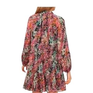 Elevate vour wardrobe with this stunning Vince Camuto black floral tiered dress. Perfect for any occasion, this dress features long sheer sleeves, a V-neckline, and a flattering A-line style. The ruffle accents and chiffon fabric add a touch of elegance to this gorgeous piece. The dress is machine washable and made of 100% polyester. It comes in size XS with a bust of 18in and a dress lenath of 33in.