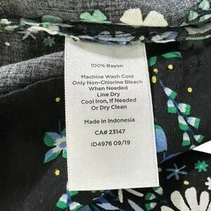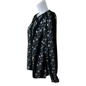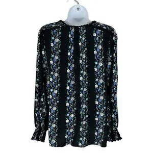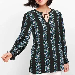 Talbots black dark floral striped blouse - Round ruffle neckline with tie neck and keyhole slit - Elastic smocking at shoulders - Long sleeves with smocked elastic cuffs - Straight hem