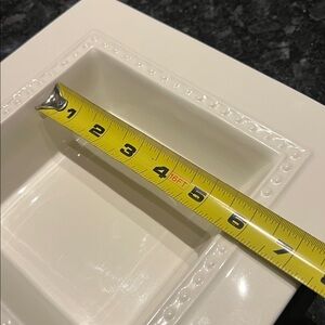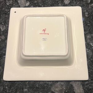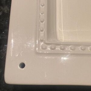 This stoneware piece is designed to be a versatile serving dish or napkin holder, and it features a raised pearl dot pattern along the edge. The dish has a small hole for inserting one of Nora Fleming's signature decorative "minis" to customize it for different occasions. Tiny chip along bottom edge side. No box. See pictures for details. Smoke free home.