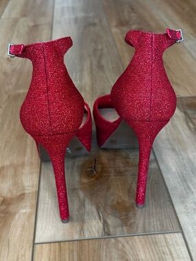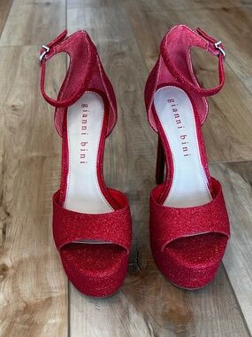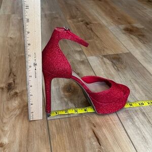 Elevate your look with these dazzling red glitter heels from Gianni Bini, featuring a tall stiletto heel and a chic ankle strap. The platform design ensures comfort while adding a dramatic flair, making them ideal for special occasions. Statement Metallic Heel in glittering red fabric