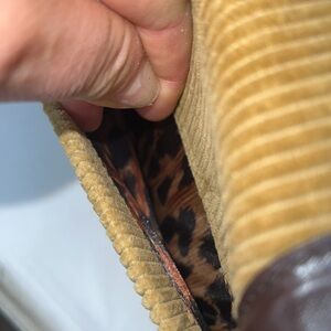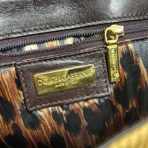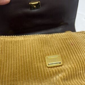 This is a beautiful Dolce and Gabbana Vintage Corduroy Leather Handbag with Crossbody Chain. Brown leather with tan corduroy. Goldtone logo’d hardware. I added a detachable goldtone chain to wear the bag as crossbody. Full back slip in pocket. Hook and bar magnetic closure. No odors. No stains. Very small red spot under the flap. Corduroy shows normal press marks that are brushed out if needed, but that is it natural state. Some very minor scuffs. Silk leopard lining. Wall zip pocket. Interior authenticity shank. 8.5” x 6” x 2.5” with 6” top handle. Made in Italy