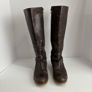 Sleek dark brown leather boots. Stylish chain detail. Perfect for any outfit.