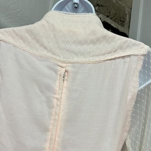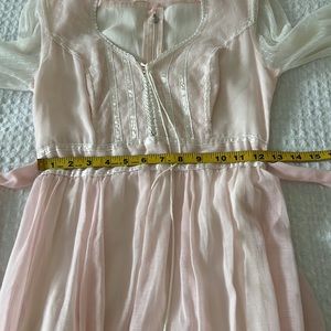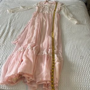Sweet, delicate 1970’s Vintage Gunne Sax maxi dress. Done in pink cotton voile with white Swiss dotted lace long sleeves. 5” cuffs with button and loop closure. Curved Victorian neckline with pearl detailing. Front lace up corset. Back partial zipper. Attached ties to cinch waist. Ribbon and lace accentuate lower skirt. Fully lined.