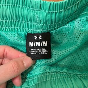 Men's under armour volley shorts + mesh lined + approx 5.5-6in inseam + neon green in color + side pockets and back pocket as shown + no flaws / good, used condition with light wear + logo on front as shown + ships from 100% smoke free home