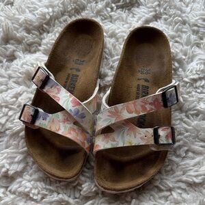 These sandals are a cute floral strap. White bottoms. These are in gently used condition. EU 36, which is about a US 5.5-6.