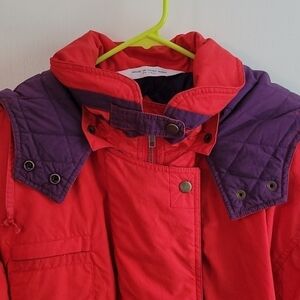 Hood is removable. Cinched at Waist and Hood. Double breasted. Has front pockets and Shoulder Pads. Metal Snap buttons. Parka style.