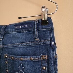 Elevate a casual wardrobe with these stylish Rock & Republic women's jeans. These mid-rise, bootcut denim jeans feature a classic blue wash with factory distressing, including fading, whiskering, and rips at both knees. The jeans are equipped with a zip fly and a logo-button closure, complemented by standard logo hardware.