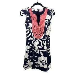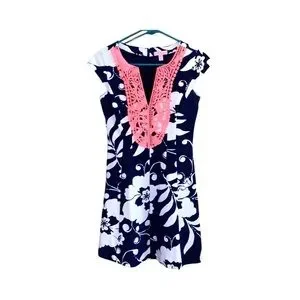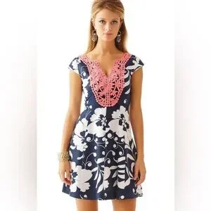 This Lilly Pulitzer dress embodies classic Palm Beach elegance with a playful, feminine twist. It features a fitted bodice with cap sleeves and a flared A-line skirt, creating a flattering silhouette. The navy blue background is adorned with large, white tropical floral prints that evoke a breezy, resort-ready vibe. The standout detail is the intricate coral pink crochet lace at the V-neckline, adding a pop of color and a touch of handcrafted charm. Made from lightweight cotton fabric, this dress perfectly balances casual comfort with sophisticated style—ideal for seaside luncheons, garden parties, or a summer getaway.