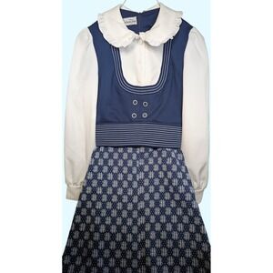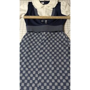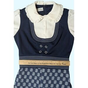 This is a rare and highly collectible 1970s "Patricia Fair" maxi dress. It features a unique Tic-Tac-Toe novelty print (X's and O's) in a vibrant royal blue and white.
