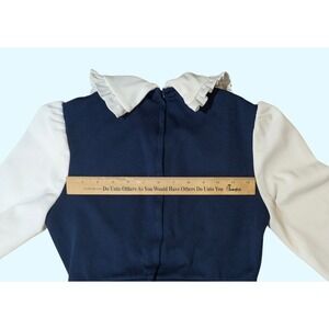 High Victorian-style ruffle collar, elasticized ruffle cuffs, and a smocked empire waist.