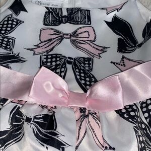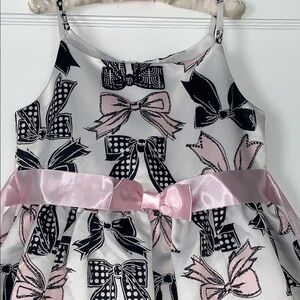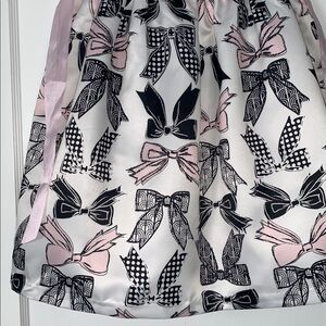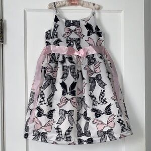 Cute, white dress with black and pink bows print. Ties with a pink sash. Zipper in back. In excellent, clean condition 🎀