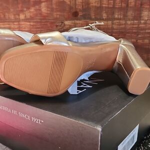 Elevate your look with these chic gold block heel sandals. Perfect for adding a touch of glamour to any outfit.