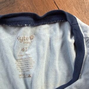 Shark print Kyte BABY pocket t-shirt, size 4T. Very good pre-loved condition. Signs of wear include some fading from washing and slight pilling; however, no stains, rips, holes, etc.