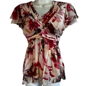 Sundance Silk Y2K Cream & Pink Floral Vneck Top, Size 2, Flutter Sleeves, Fitted