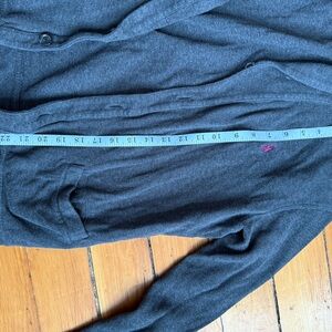 Charcoal cardigan with button front. Shawl collar and front pockets. Ideal for layering.