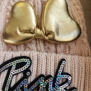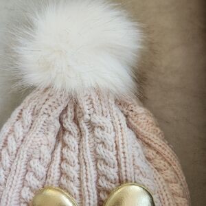 NWOT elegant blush knit hat with a shiny gold heart bow. Topped with a soft pom-pom and front bling "Pink" wording. Soft furry fleece inside. Perfect for a stylish look. So cute!