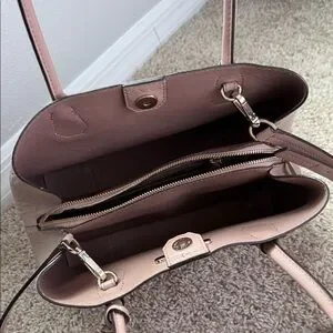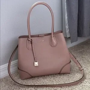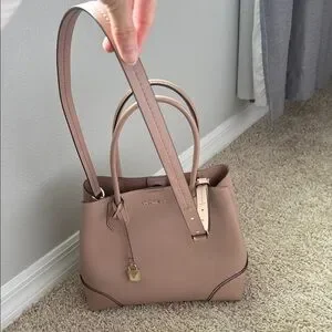 Chic Michael Kors satchel in blush leather. Features elegant handles and a detachable strap. Perfect for versatile styling.