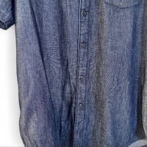 navy chambray, short sleeve, cotton shirt, button front, chest pocket, relaxed fit, casual style, summer top, lightweight fabric, men's apparel
